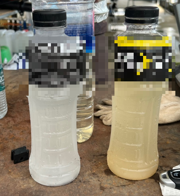 왼쪽의 흙탕물이 들어와도 오른쪽 처럼 투명하게 정수가 됩니다.(가장 오른쪽이 원수입니다.)