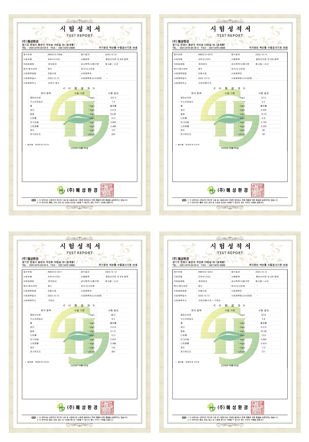 전용용액을 사용하게 되면, 중탄산 200ppm이상의 원수가 50ppm으로 감소하고, 나트륨 역시 15% 정도 감소하는 효과를 확인하였습니다.