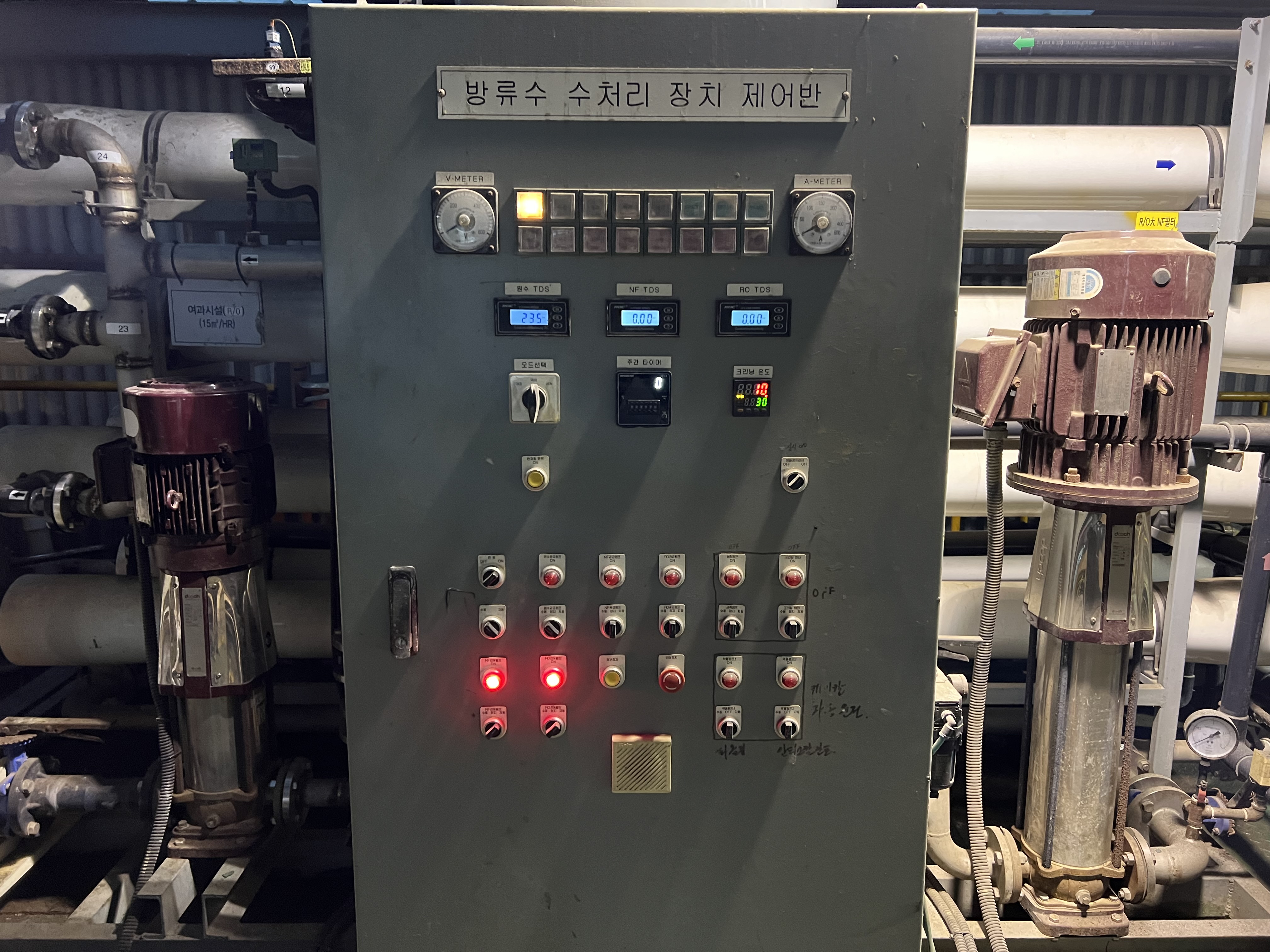 아래 사진을 보면 수처리 정수 설비 판넬의 동작이 문제가 생겨 저희가 가서 현장을 확인하고 조치를 취하였습니다.