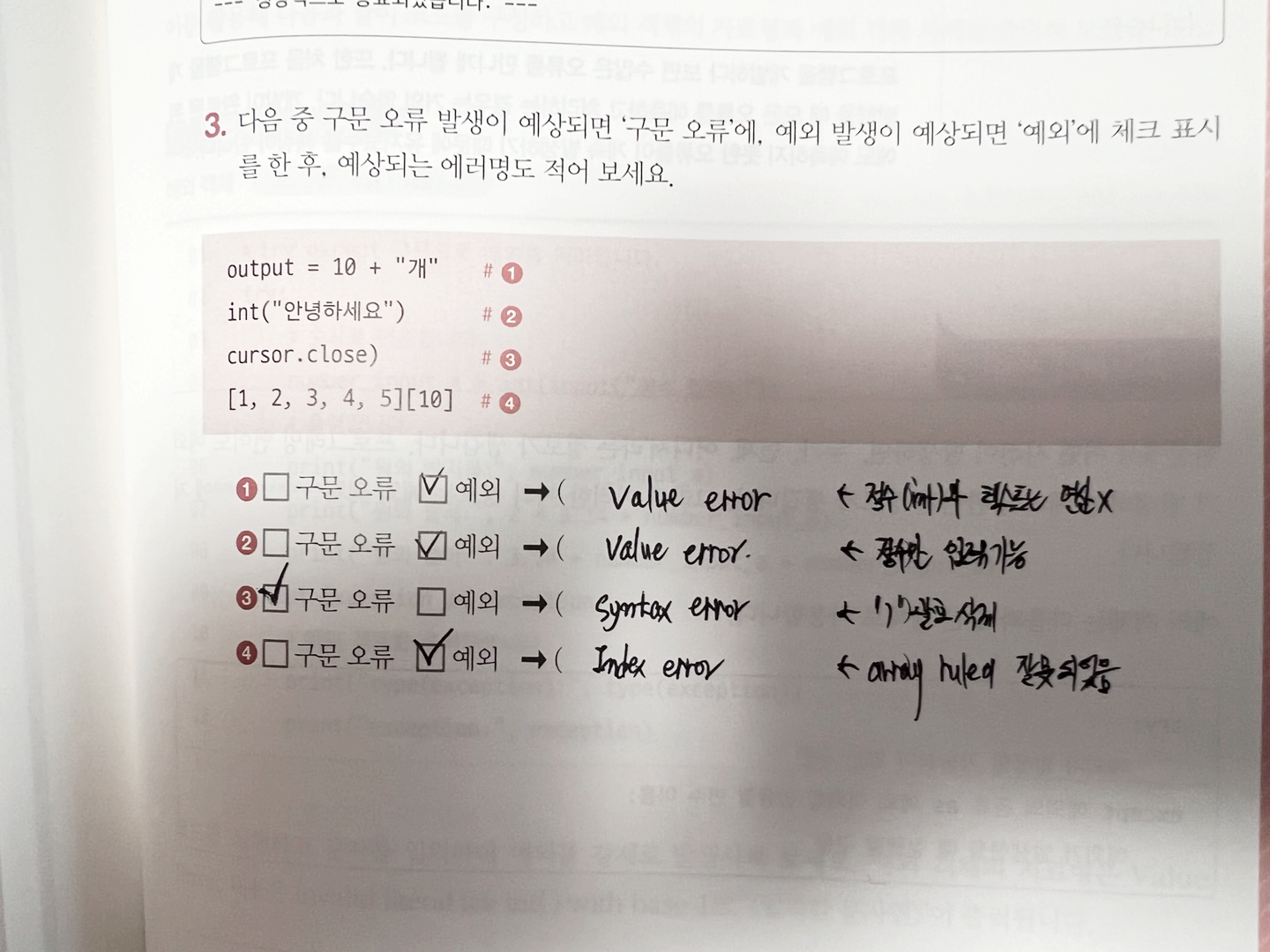 위의 연습문제를 풀면서, 예외와 구문오류를 완벽하게 이해하게 되었습니다.